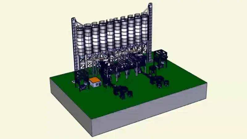 واعتمادًا على التركيب المختار، تتراوح الطاقة الإنتاجية في الساعة بين 10 إلى 30 طن، حيث يضع الهيكل المصمم على شكل برج صوامع المسحوق في الجزء العلوي من مبنى المعالجة الرئيسي، مما يسهل تدفق المواد بكفاءة. كما يتم قياس المواد المضافة بدقة وضخها عبر نظام تحديد الجرعات (الكميات) ونقلها عبر منصة مستقلة. ثم تمر المواد الخام بالتتابع من خلال أنظمة الوزن، والخلاطات عالية الأداء، وصوامع المنتج النهائي، ووحدات التحميل أو التعبئة الآلية للسوائب.