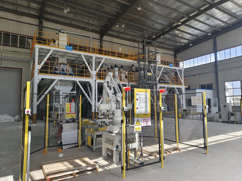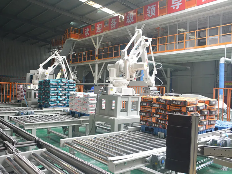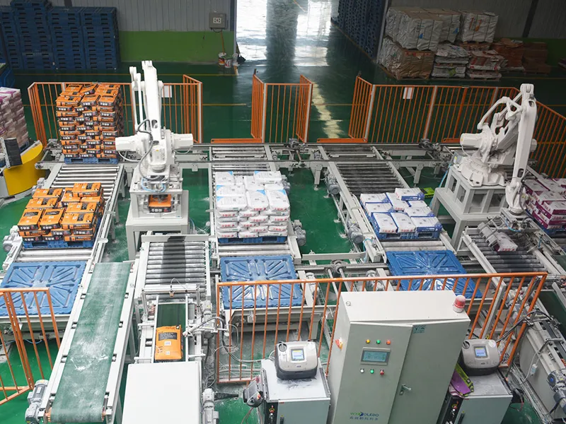 وأثناء التشغيل، يضع الذراع الروبوتية نفسه بدقة لالتقاط الأكياس باستخدام مؤثره النهائي، إما لتوليد شفط بالتفريغ أو استخدام قوة إمساك ميكانيكية للتعامل مع المواد بشكل آمن. وبعد التقاط الأكياس، يقوم الذراع بنقلها ووضعها بدقة على منصات نقالة وفقًا لأنماط تكديس قابلة للتخصيص مثل التكديس المتشابك أو التكديس على شكل صفوف وأعمدة. وطوال هذه العملية الأوتوماتيكية، تراقب المستشعرات باستمرار حركات الروبوت وأداء الإمساك لضمان السلامة والموثوقية والدقة في التكديس على المنصات النقالة.